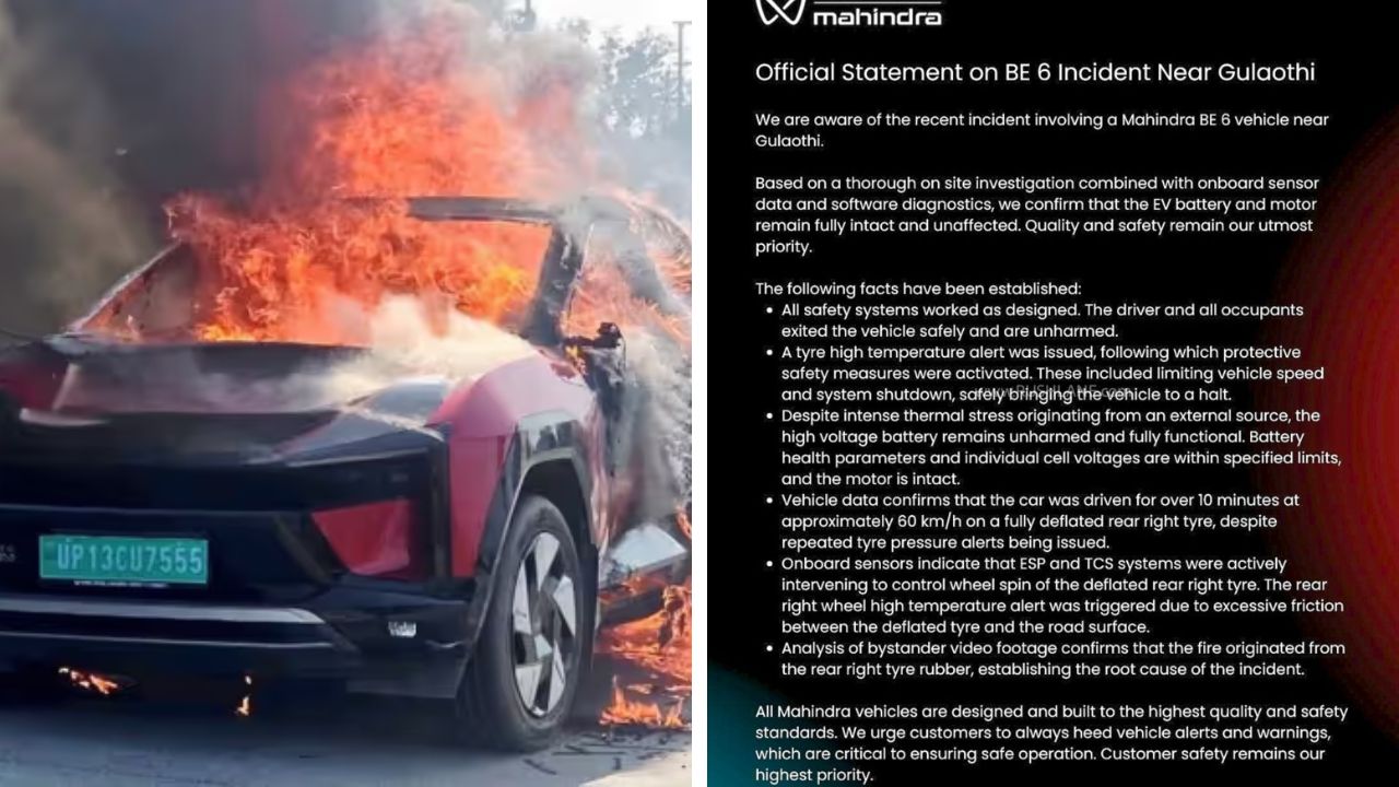 The brand clarified by stating, “We are aware of the recent incident involving a Mahindra BE 6 vehicle near Gulaothi. Based on a thorough on-site investigation and data from onboard sensors and software diagnostics, we confirm that the EV battery and motor are fully intact and unaffected. Quality and safety remain our top priority.”