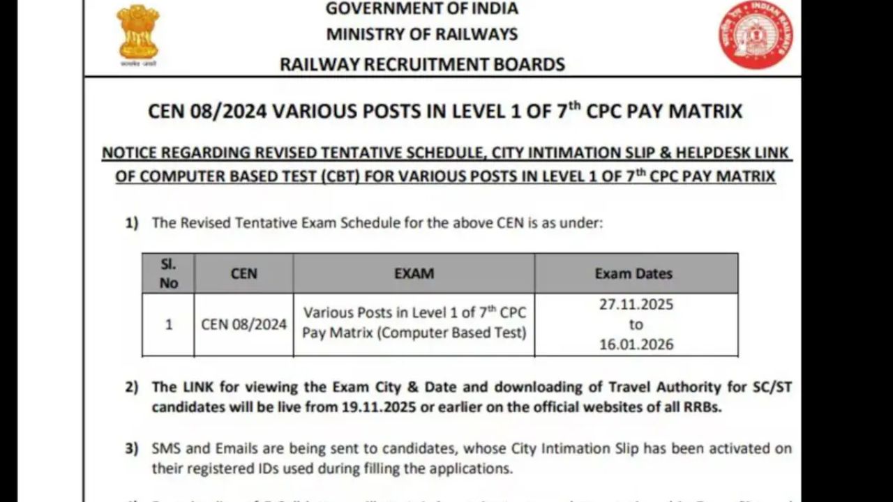 The Railway Recruitment Board (RRB) has announced the RRB Group D Exam Date 2025. The exam now scheduled from November 27, 2025, to January 16, 2026. This new timetable comes after the original dates, set from November 17 to December 31, 2025, postponed. The updated schedule is available on the official RRB website.