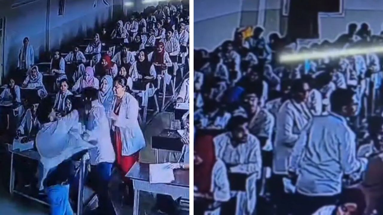 The footage shows Assistant Professor Shivaraj kumar confronting a student named Shahbaz after he was caught using a mobile phone to copy answers. When the professor took the answer sheet and told the student to leave, things quickly escalated.