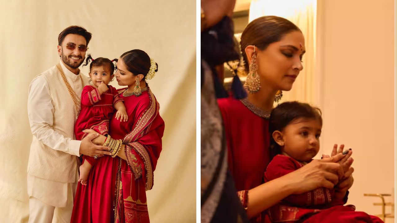 In the photos, Ranveer Singh and Deepika Padukone are dressed in elegant traditional outfits. Ranveer wore an off-white kurta with a matching coat and a neckpiece. Deepika looked stunning in a red suit paired with striking jewellery. Dua Padukone looked adorable as she matched with her mother and smiled for the cameras.