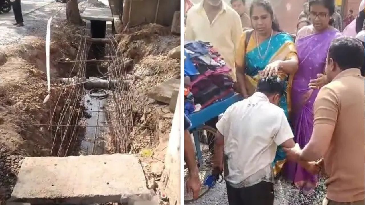 The mishap took place this morning in Govindpura, Sarvagna Nagar, right in front of a school where civic repair work was ongoing. Local residents claimed that workers left the drain uncovered during maintenance. They did not put up basic safety measures like barriers or warning signs, turning a typical sidewalk into a hidden danger.