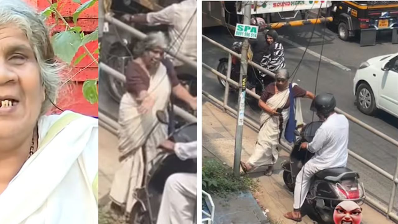 An elderly woman in Kozhikode, Kerala, stopped a man on a scooter from using a footpath to bypass traffic. She refused to move until he returned to the main road.