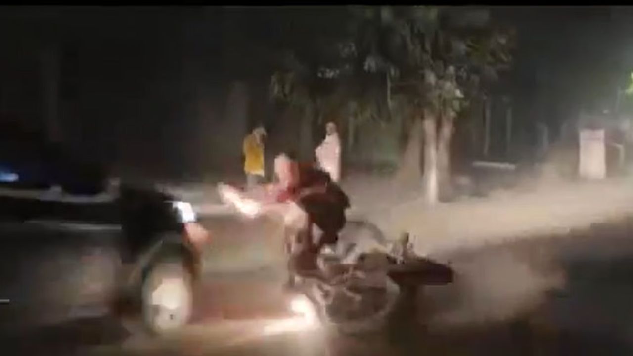 According to a video circulating online, the motorcycle was traveling at a moderate speed on the dimly lit stretch of Ramlila Road when it suddenly hit a patch of loose gravel and soil scattered unevenly across the lane. The biker immediately lost traction. The rear wheel fishtailed, causing the rider to lose balance. Within seconds, the motorcycle skidded sideways and slid toward the opposite lane.