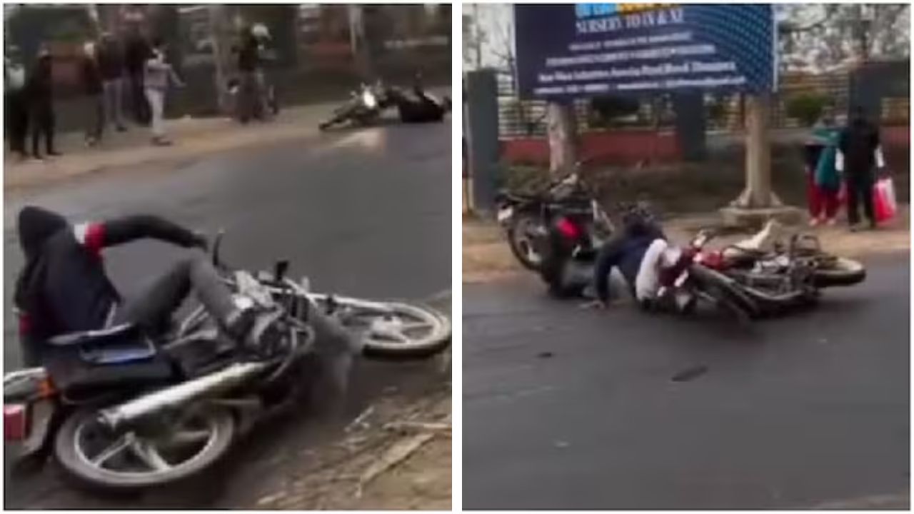In Amroha district, a sudden stretch of slippery UP Road became dangerous for motorcyclists. Dozens of riders skidded and fell, resulting in several injuries while narrowly avoiding a major accident.