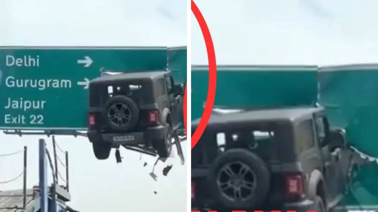 A video is going viral on social media that shows a Mahindra Thar SUV crashing into a high highway exit sign. In the clip, the sign reads “Delhi, Gurugram, Jaipur,” along with “Exit 22” and “NH-48.”