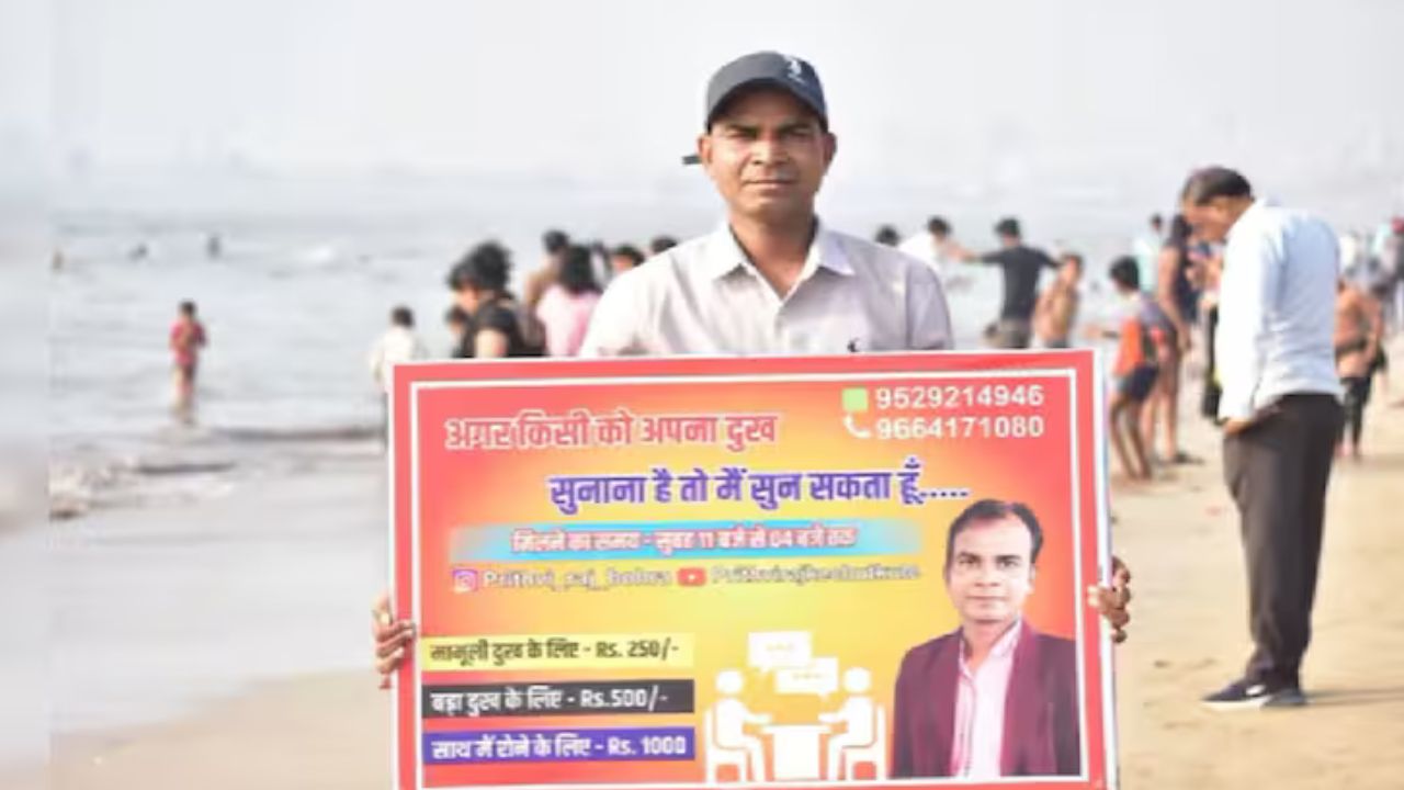 Recently, a man gained attention on social media for listening to your troubles at Mumbai beach. A short video shared shows him holding sign in Hindi that says, “Kisi ko apna dukh sunana hai to main sun sakta hun.” It means if anyone wants to share the sorrow, I can listen.”