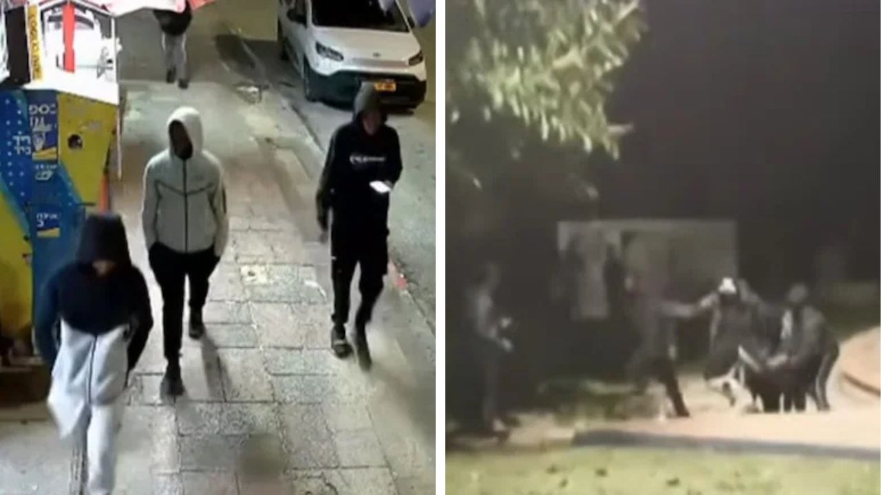 CCTV footage depicts the two men walking along a footpath, closely followed by three or four individuals in hooded jackets. The video then cuts to a nearby public park, where several of the hooded assailants hold one of the men while another repeatedly punches him.